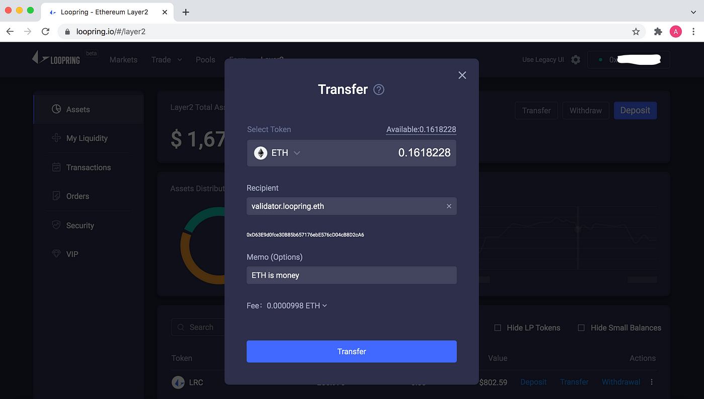 The ‘Transfer’ button is also where you can send assets on L2 to any other Ethereum address — whether they have previously used Loopring L2 or not. It is ideal for payments, especially frequent ones to many people!
