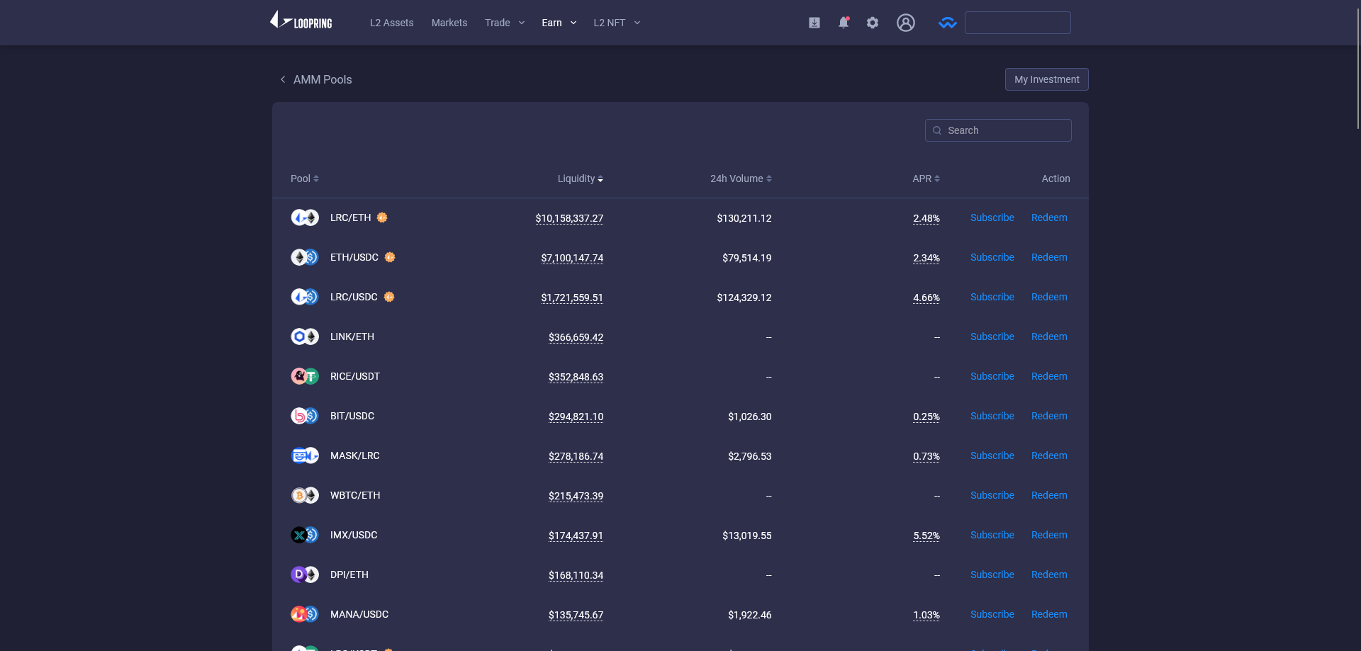 Under ‘<mark style="color:blue;">AMM Pool</mark>’ on ‘<mark style="color:blue;">Earn</mark>’, here you’ll see the liquidity in each pool, the volume, and if there are any LRC liquidity mining or other incentive programs.