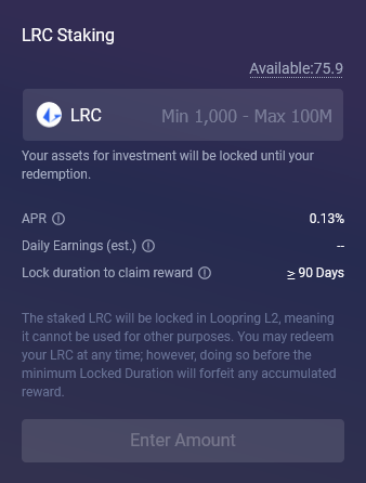 Staking LRC is a <mark style="color:blue;">risk-free</mark> investment! Your locked assets can always be withdrawn at any time.&#x20;